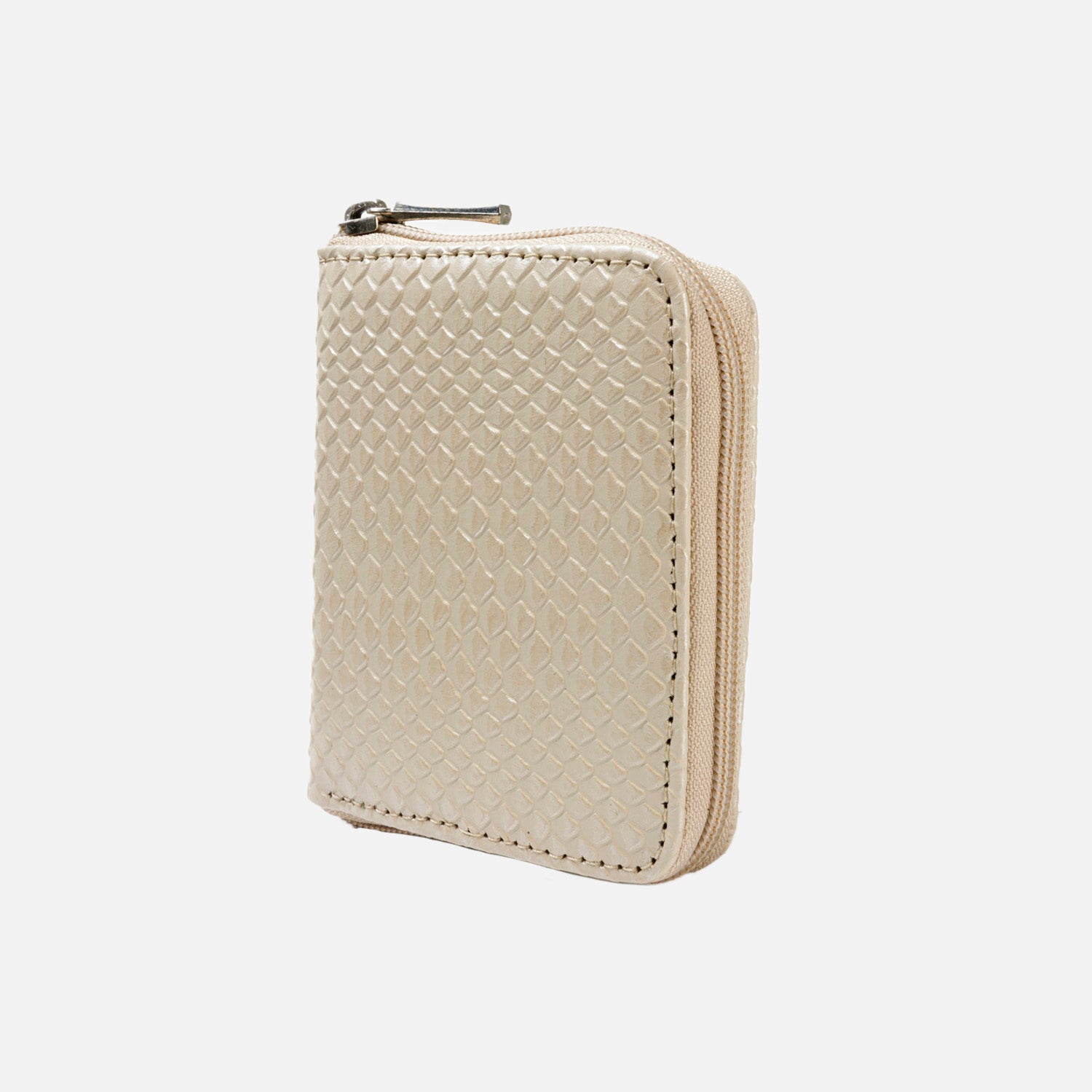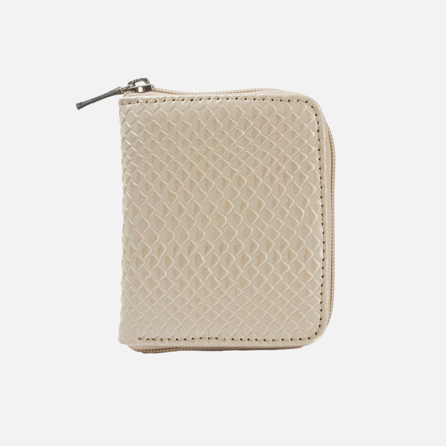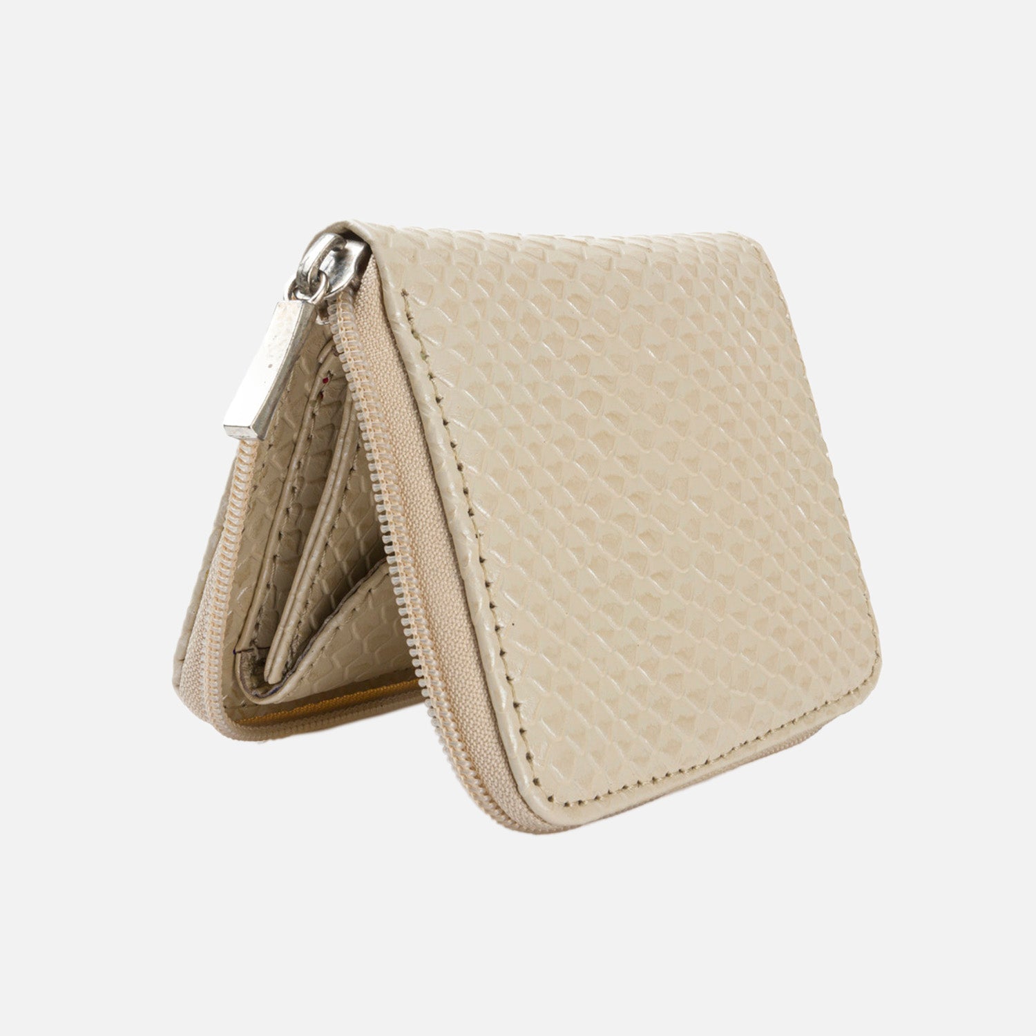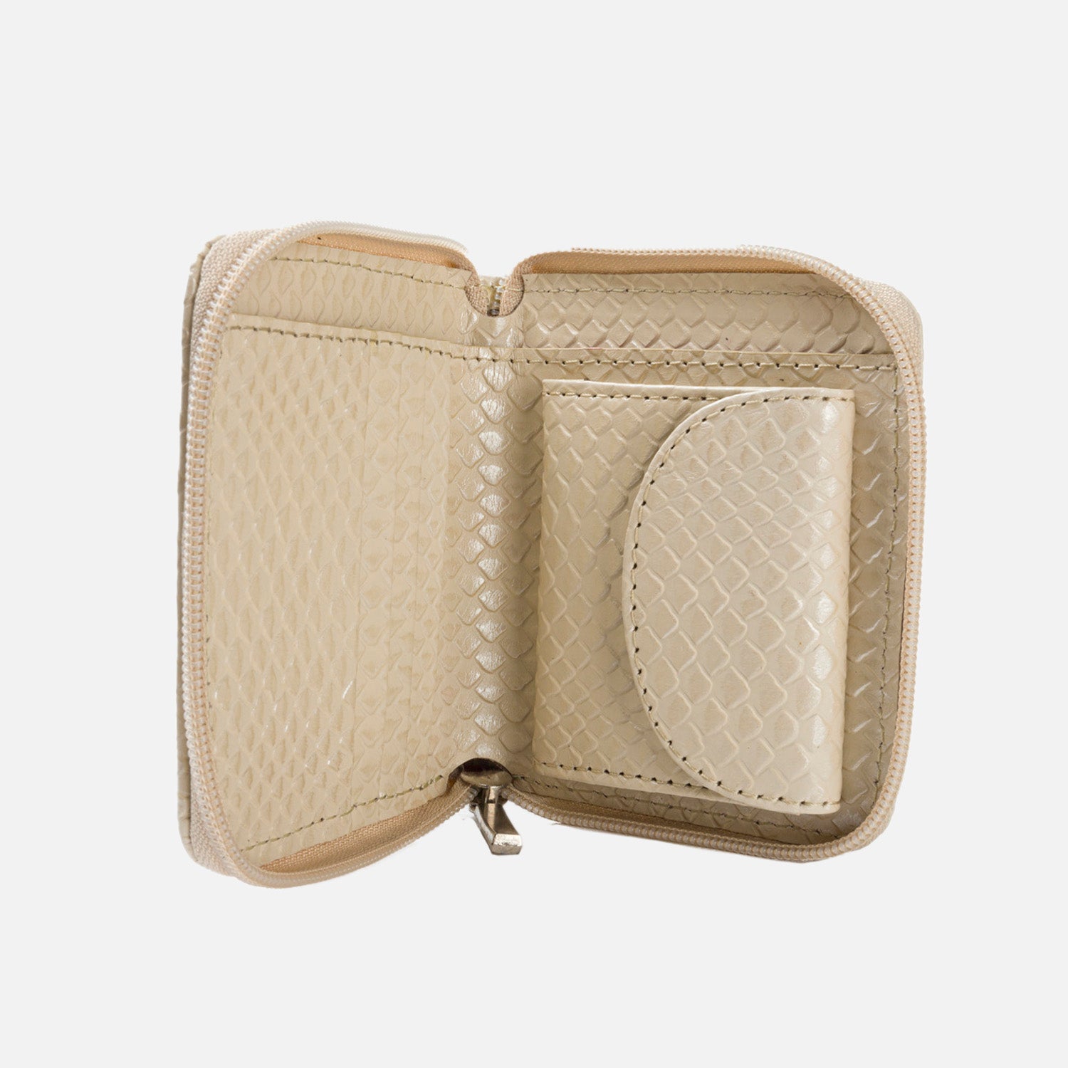 Billetera en cuero color beige, simulando cuero de culebra sus son 11.5 cms de ancho con 9.5 cms de medidas altura, compartimentos para billetes, tarjetas y monedas