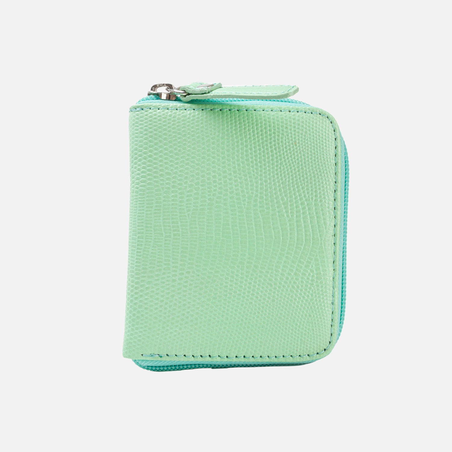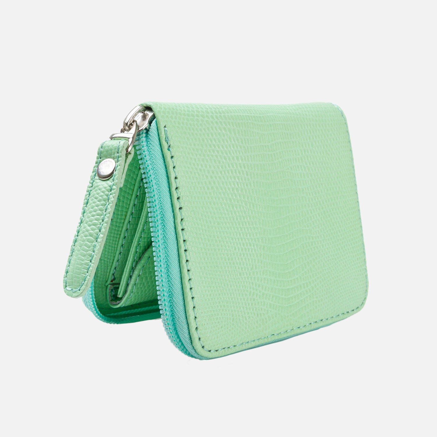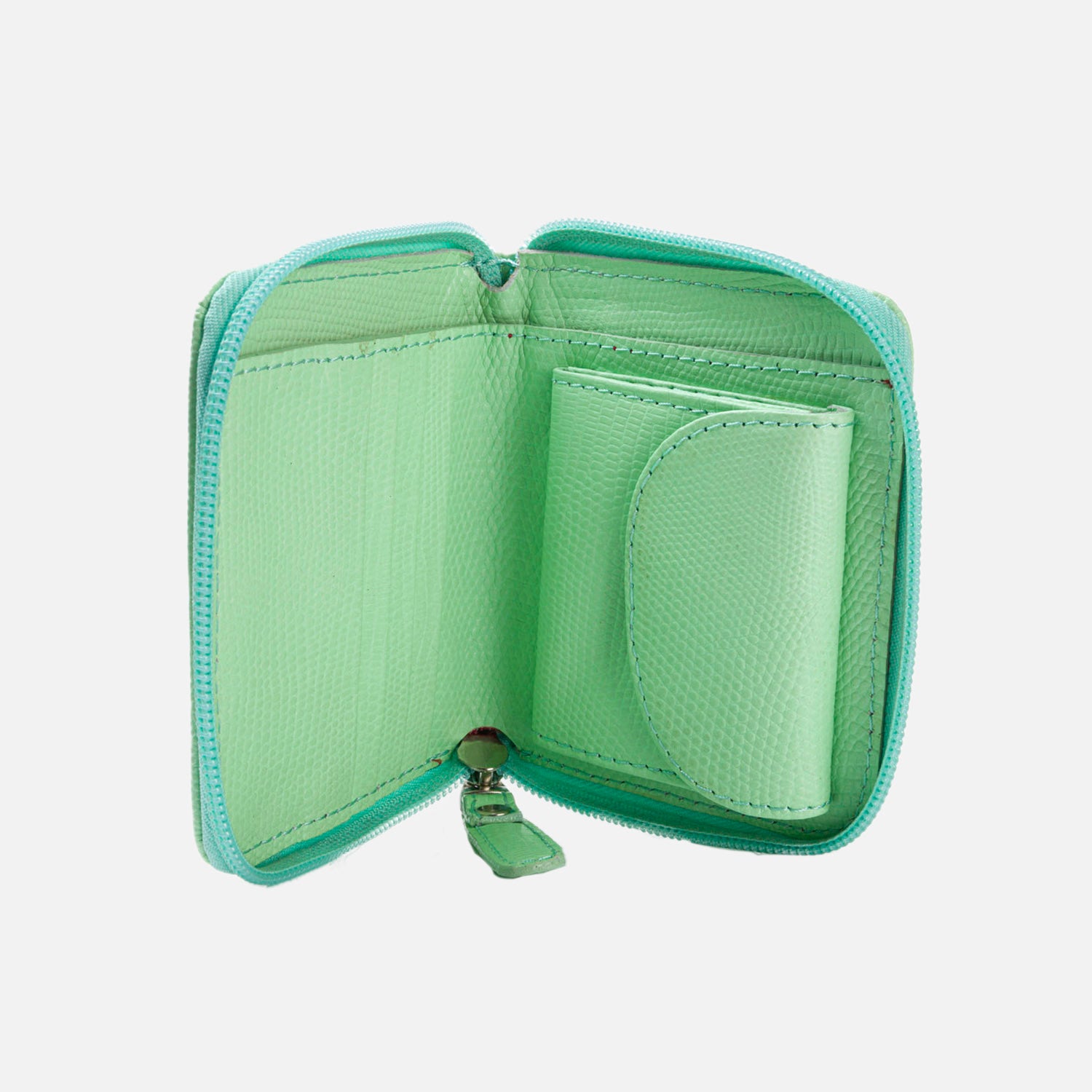 Billetera en cuero color verde menta, sus medidas son 11.5 cms de ancho con 9.5 cms de altura, compartimentos para billetes, tarjetas y monedas