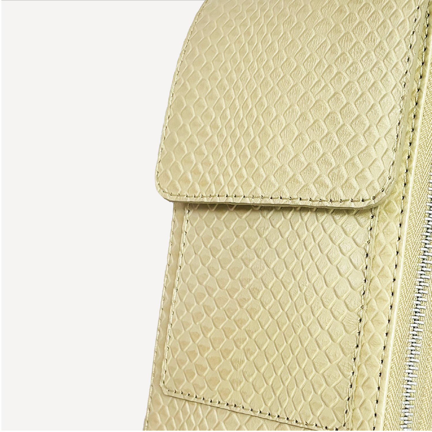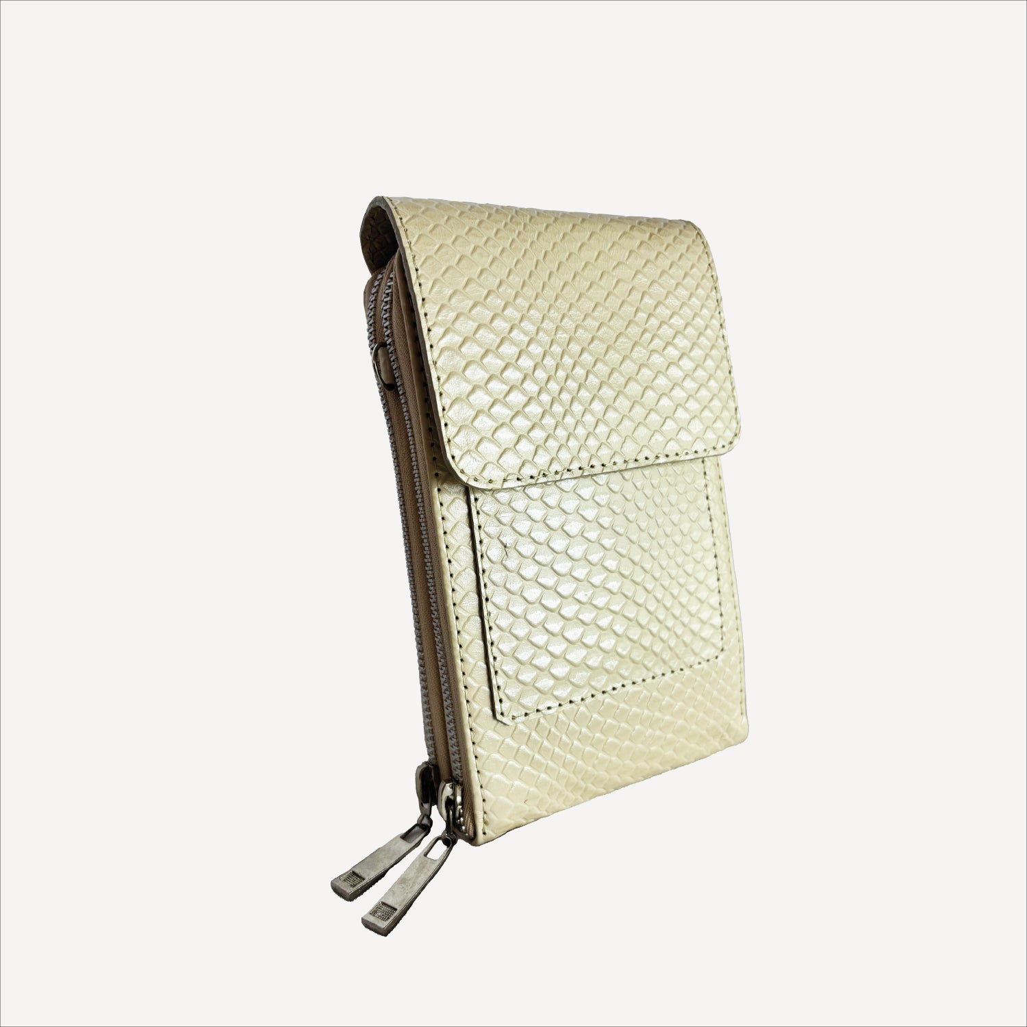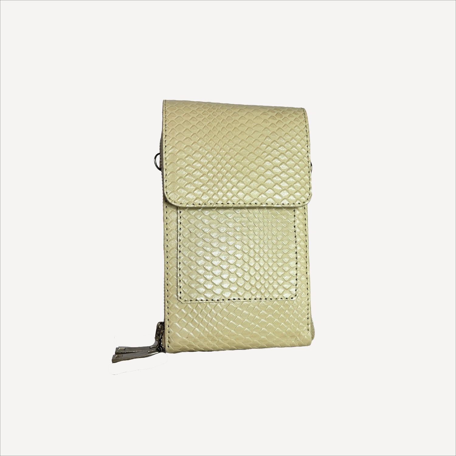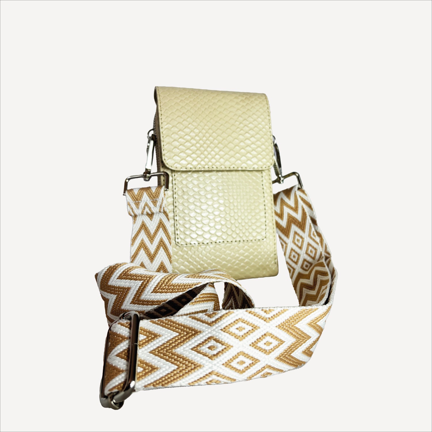 Bolso pequeño porta celular, perfecto para cruzar, con correas delgadas, con bolsillos internos y en su parte de atrás un bolsillo transparente ideal para portar el celular color beige, con correa en tela tejida.