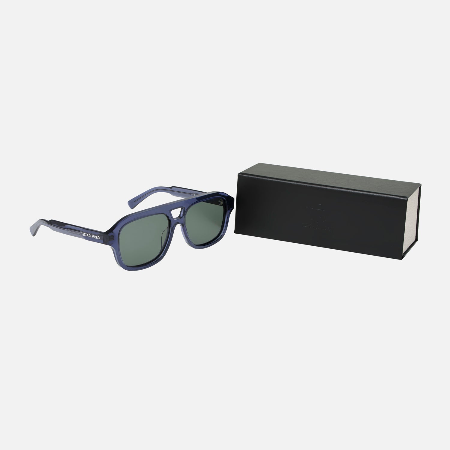 Gafas de sol con filtro UV400 lente polarizado negro claro, marco mediano grueso en color azul transparente, sus medidas son: ancho de lente 5,1cms, puente nasal 4,3 cms, largo de patas 14 cms.