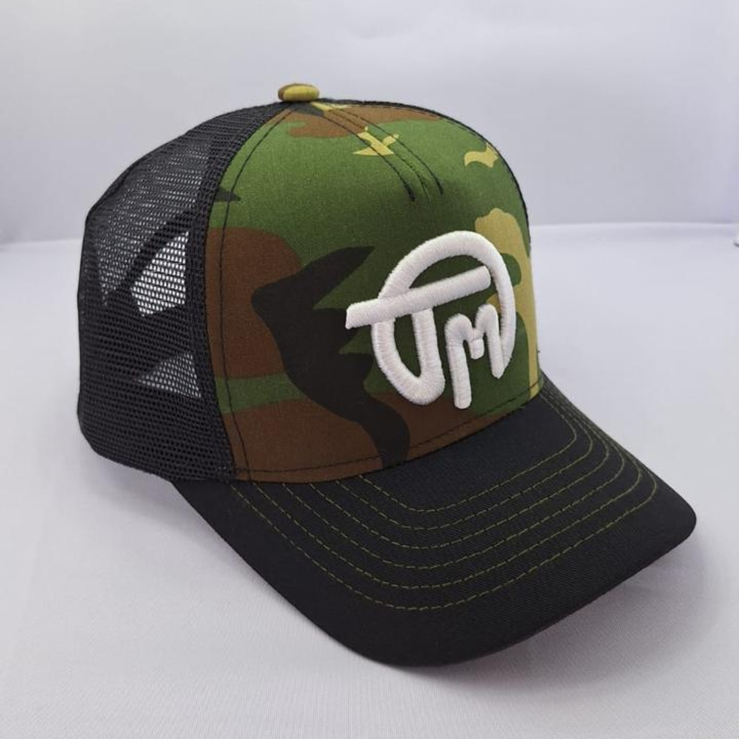 Gorra camuflada, logo blanco malla negra, nombre lateral blanco, vicera negra