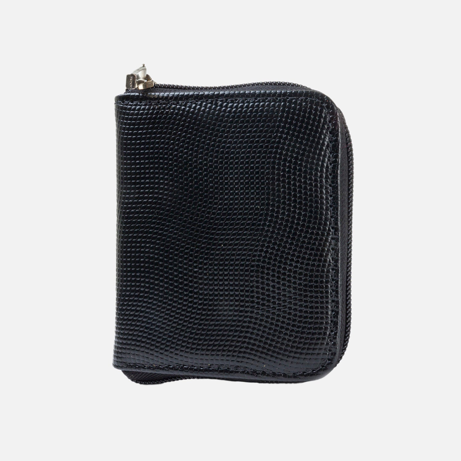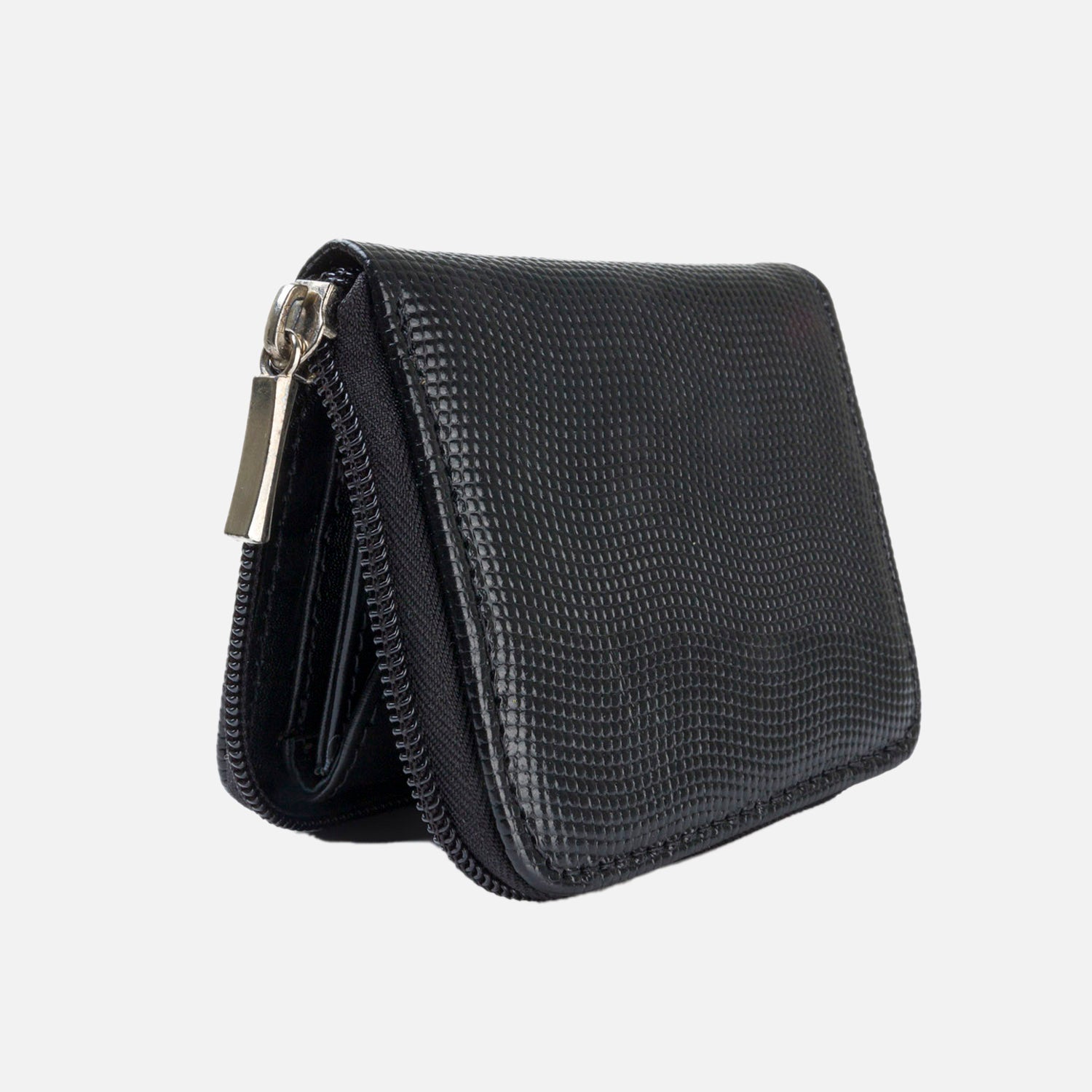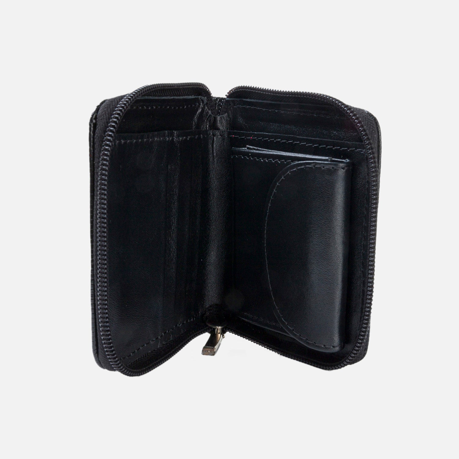 Billetera en cuero color negro, sus medidas son 11.5 cms de ancho con 9.5 cms de altura, compartimentos para billetes, tarjetas y monedas