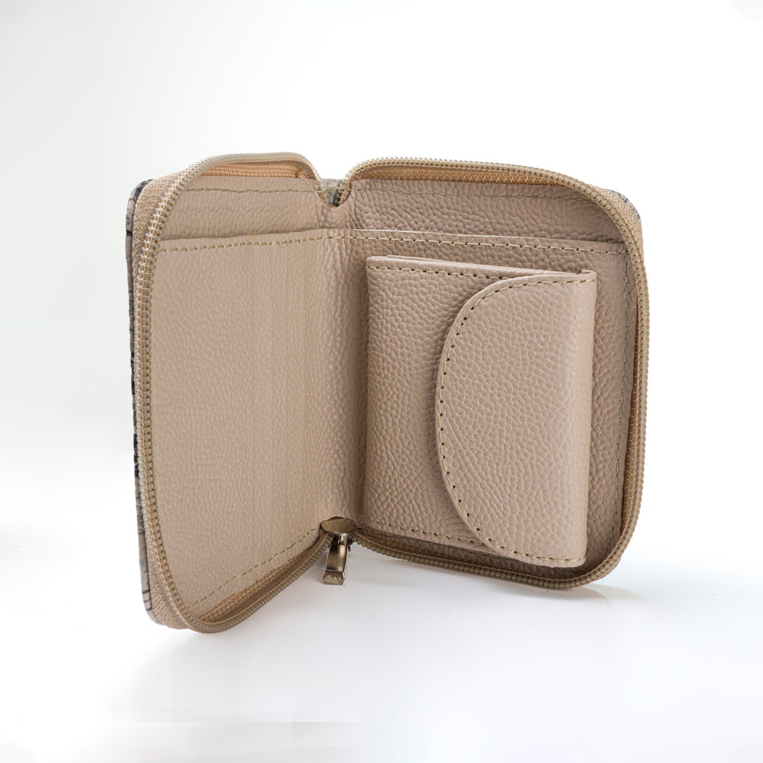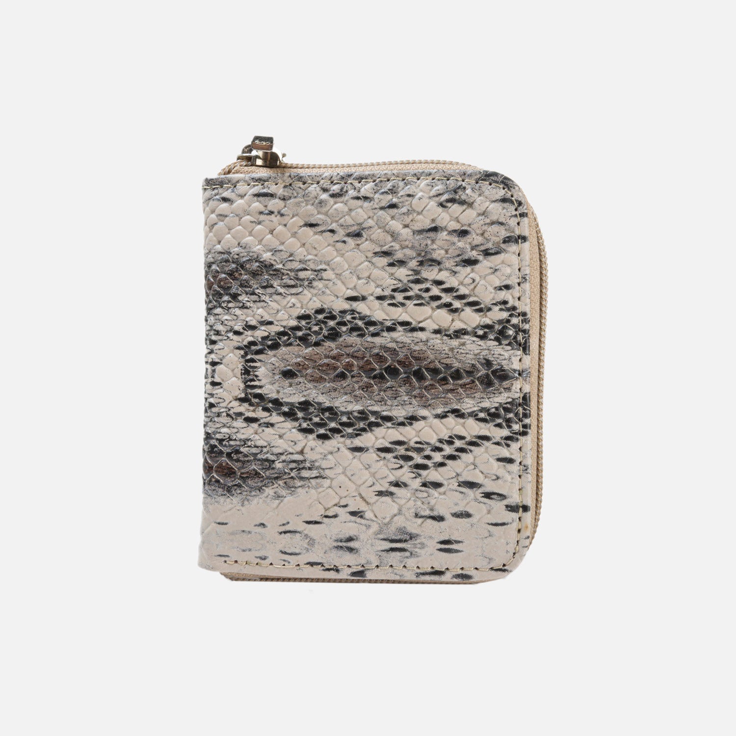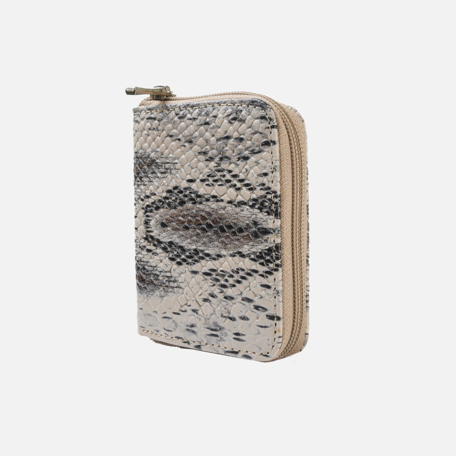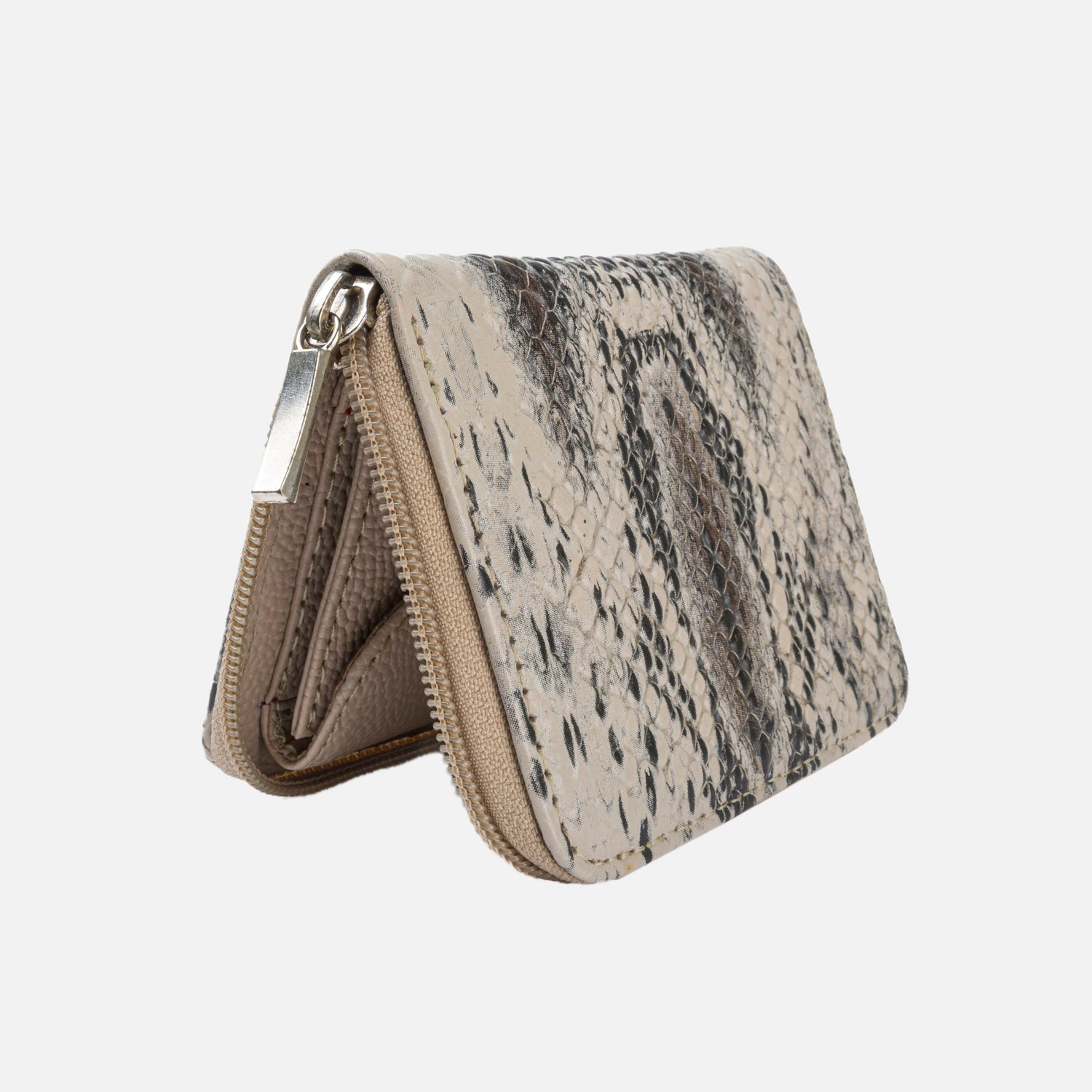 Billetera en cuero color beige veteado, simulando cuero de boa sus son 11.5 cms de ancho con 9.5 cms de altura, compartimentos para billetes, tarjetas y monedas