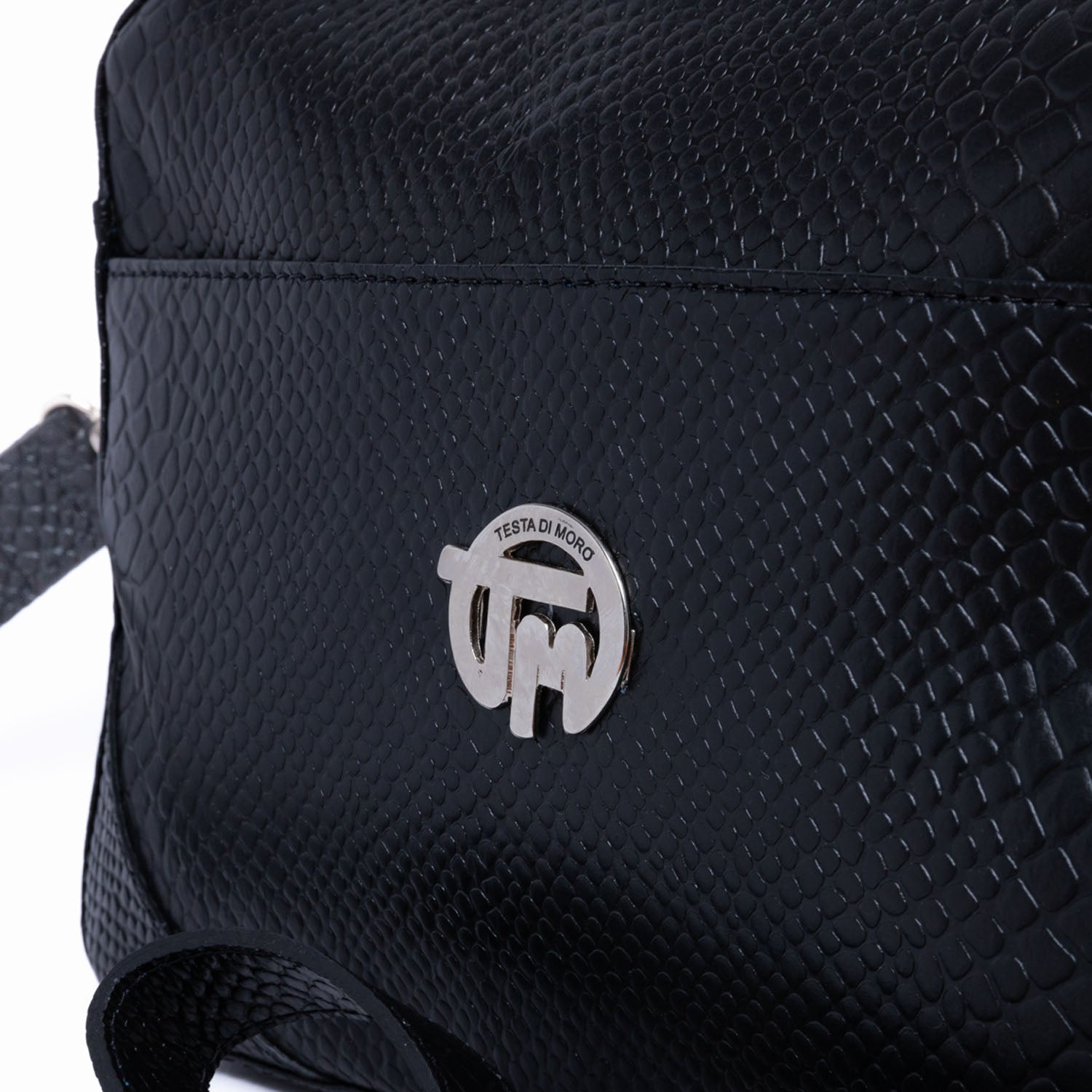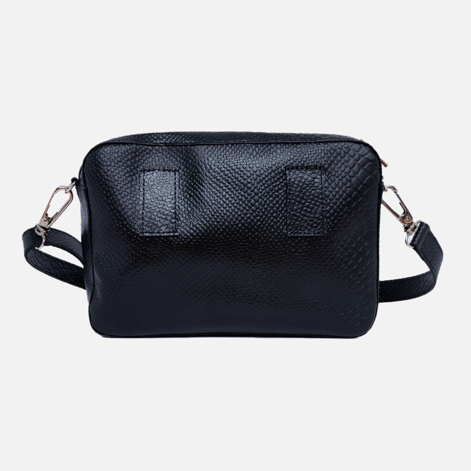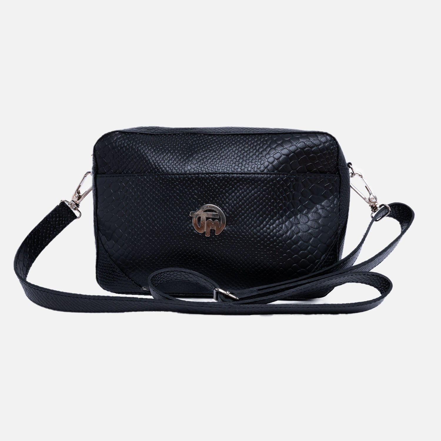 Cartera cuero babilla Negra grabado sus medidas son 25 cms de ancho con 17 cms de altura, en su parte interior un compartimento para celulares o llaves y un pequeño bolsillo con cierre