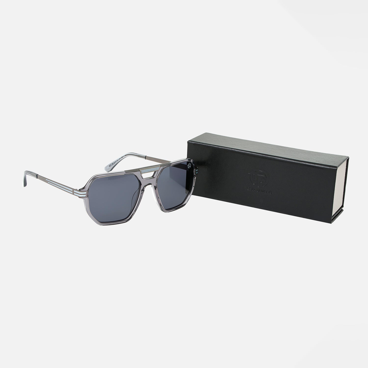 Gafas de sol con filtro UV400 lente polarizado negro claro, marco grande delgado transparente, sus medidas son ancho de lente 5,1 cms, puente nasal 4,3 cms, largo de patas 14 cms